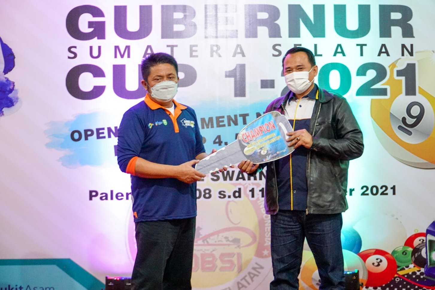PALEMBANG | Gubernur Provinsi Sumatera Selatan (Sumsel) H. Herman Deru memberikan hadiah bagi pemenang Turnamen Nine Ball Gubernur Sumsel Cup I 2021 sebuah mobil Daihatsu Ayla. Herman Deru mengakui, hal tersebut merupakan bentuk apresiasinya terhadap pelaksanaan turnamen Nine Ball Gubernur Sumsel Cup I yang telah berhasil menyedot peserta dari luar Sumsel.