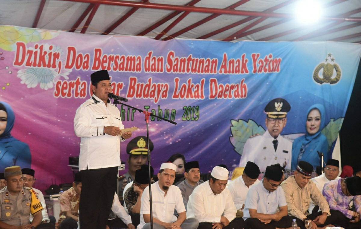 BANYUASIN,OBOR SUMATERA-Bupati Banyuasin H. Askolani, SH., MH didampingi Wabup Slamet Somosentono, SH Bersama Masyarakat Kabupaten Banyuasin menggelar zikir dan doa bersama juga Santunan anak Yatim di malam tahun baru 2020.