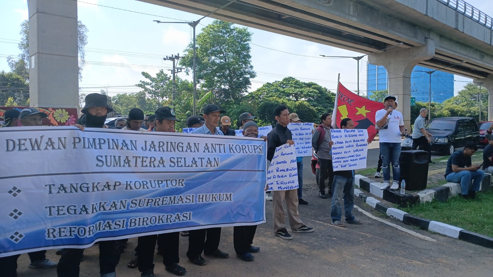 PALEMBANG, Obornusantara.com– Puluhan massa yang tergabung dalam Jaringan Anti Korupsi Sumatera Selatan (Jakor Sumsel) menggelar aksi demonstrasi di depan kantor Kejaksaan Tinggi (Kejati) Sumatera Selatan, Jumat (18/7/2025). Aksi tersebut menjadi langkah awal Jakor Sumsel dalam menyoroti dugaan praktik korupsi dan penyalahgunaan kekuasaan di tingkat desa yang dinilai telah melukai rasa keadilan masyarakat.