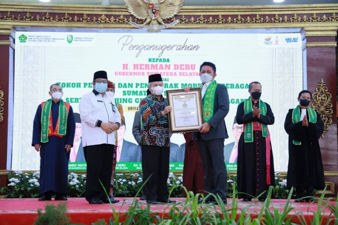 “Kita sebelum memberikan penganugeraan ini kami mengumpulkan para mejelis-majelis agama dan kita telah sepakat bahwa penganugerahan itu sangat layak di berikan kepada Gubernur Herman Deru,” ucapnya.